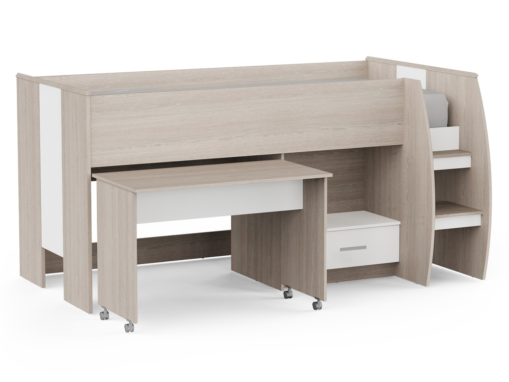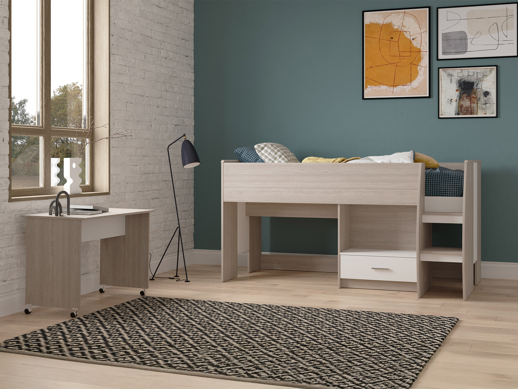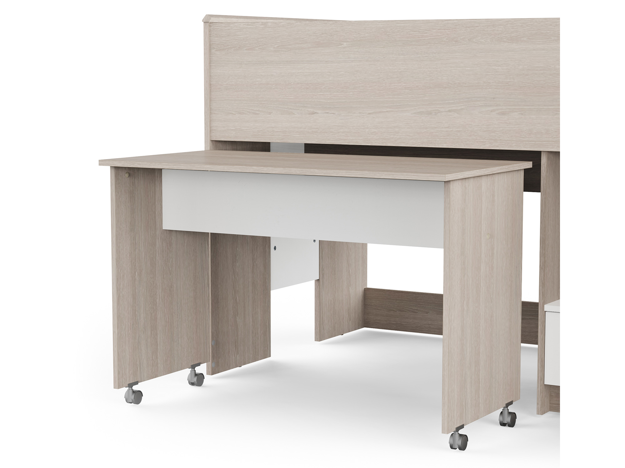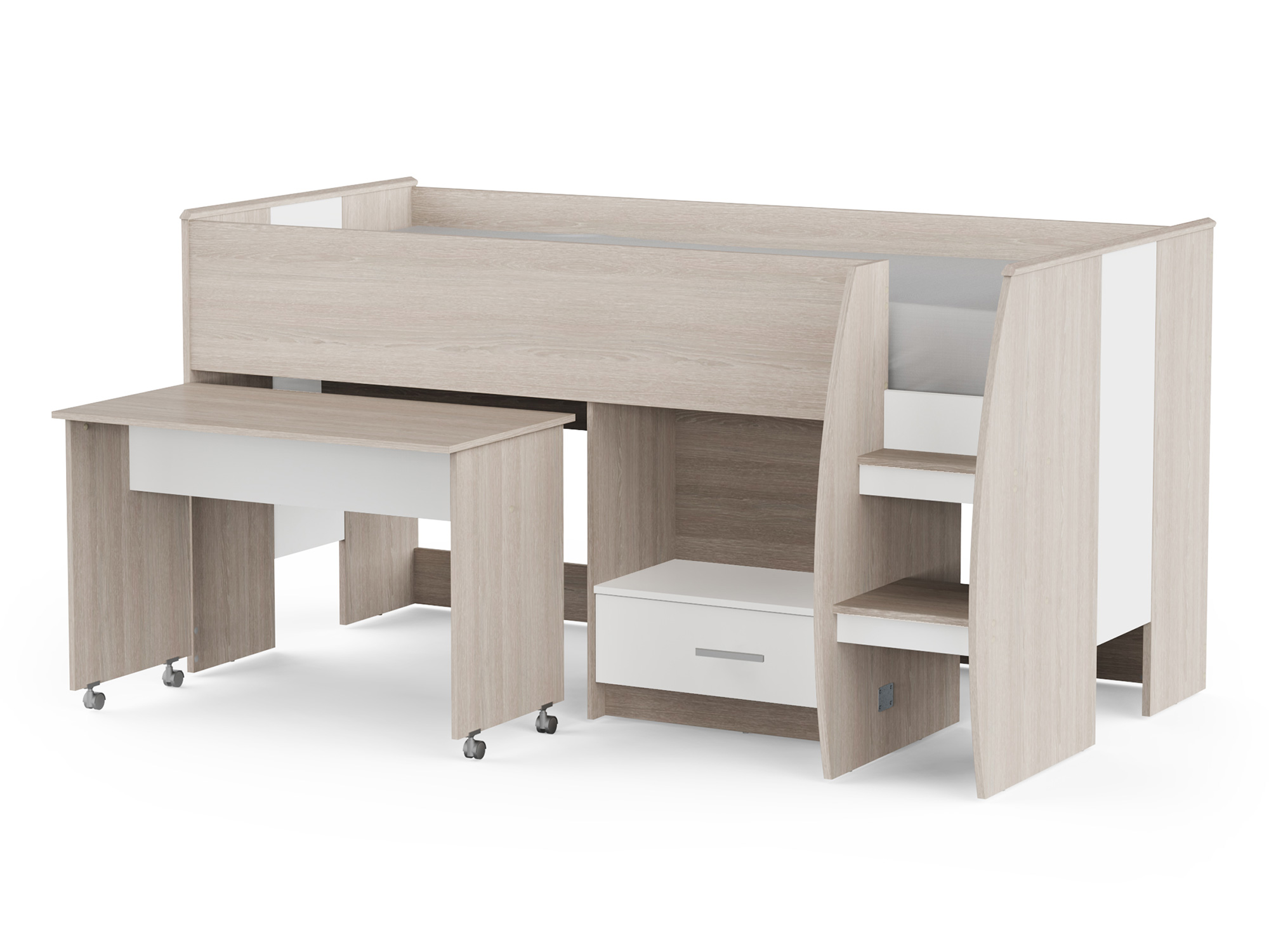Lit combiné 90x200 et bureau en panneaux de particules 15 et 18 mm. Décors blanc mat, Chêne