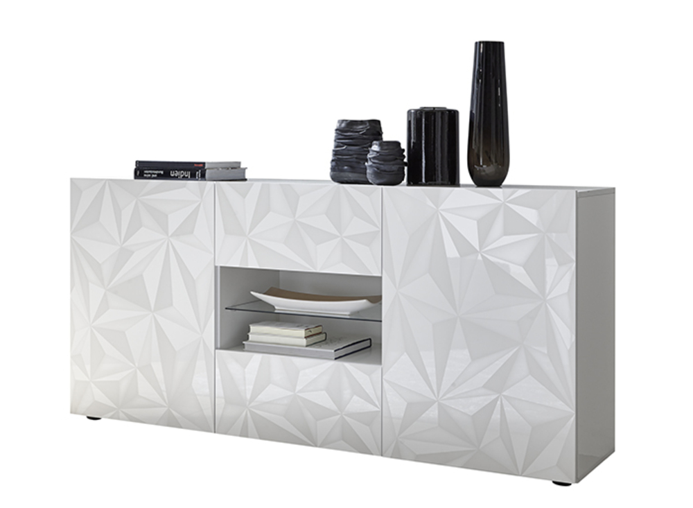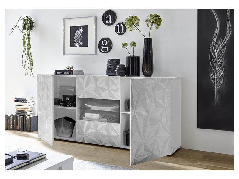 Très lumineux et élégant avec ses sérigraphies en façades, le bahut Prisme blanc a une structure solide en panneaux de particules d’une épaisseur de 16mm. Les portes et les tiroirs disposent respectivement de charnières et de guides en métal. Un éclairage est proposé en option. Fabriqué en Italie, le bahut Prisme blanc est à assembler à l’aide de la notice fournie.