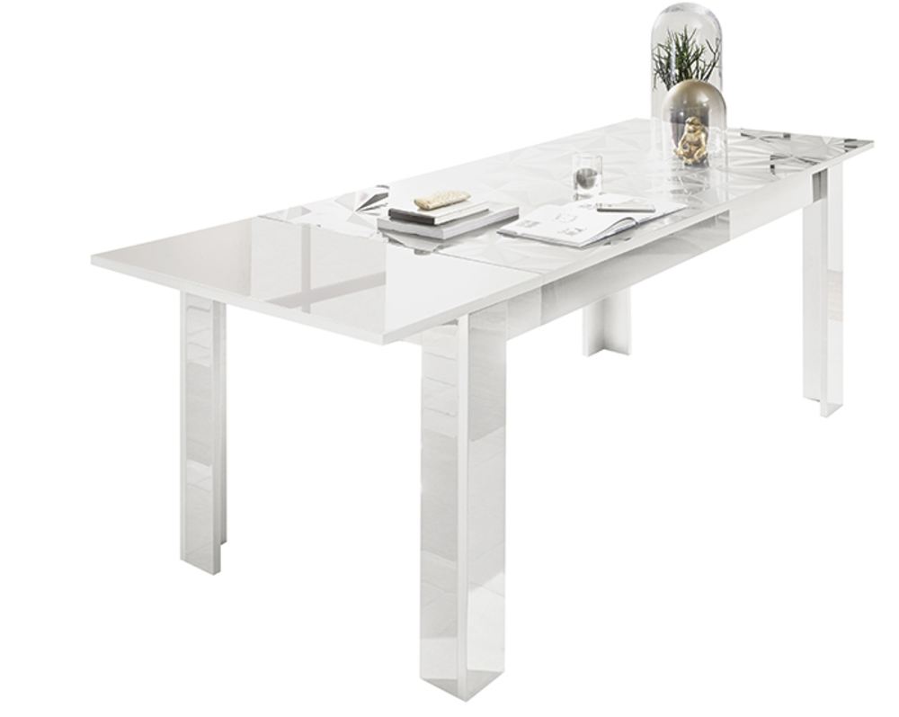 La table de repas extensible Prisme trouvera facilement sa place dans un intérieur moderne et y apportera plus de charme, notamment grâce à son plateau avec sérigraphies. La structure est en panneaux de particules de 16mm d’épaisseur. Fabriquée en Italie, la table de repas extensible Prisme blanche vous sera livrée en 2 colis.