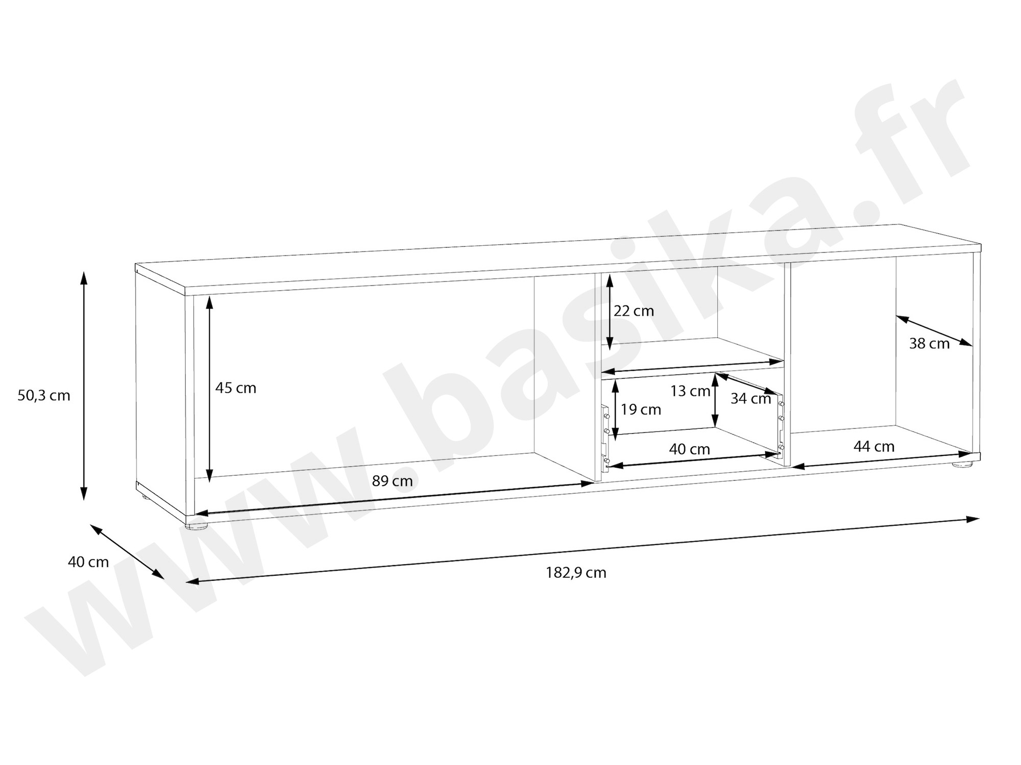 Panneau de particules revetu de décor. Epaisseur des différents plateaux: 15 à 22 mm. Tiroirs sur glissières métalliques..