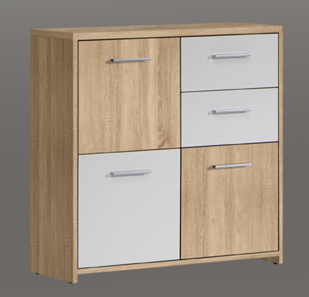 Créée à partir de panneaux de particules revêtus délicatement de décor chêne clair et blanc, la commode 3 portes et 2 tiroirs quadro est le meuble adéquat pour votre chambre. Elle apportera tous les rangements nécessaires sans pour autant encombrer l'espace, avec une largeur et une hauteur de 77 cm ainsi qu’une profondeur de 29,6 cm.