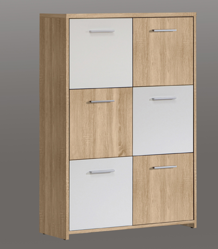 Parmi le grand choix de meubles de rangement pour chambre, cette commode quadro en imitation chêne clair et blanc avec 6 portes saura sans doute vous satisfaire.