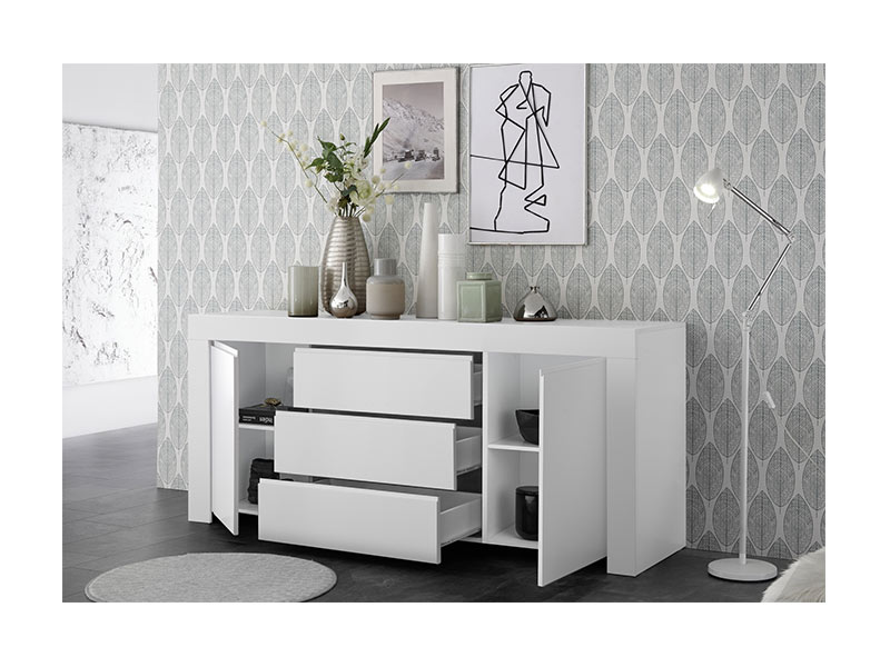 Modernisez votre séjour avec ce joli bahut italien Rapallo blanc laqué mat. Doté de 2 portes avec charnières en métal et de 3 tiroirs avec guides en fer, ce modèle accueillera aisément votre vaisselle.