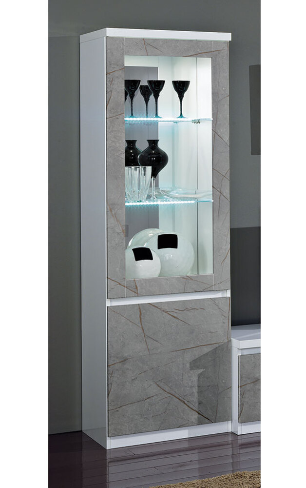Vitrine 1 porte avec led Roma laqué blanc/marbré gris