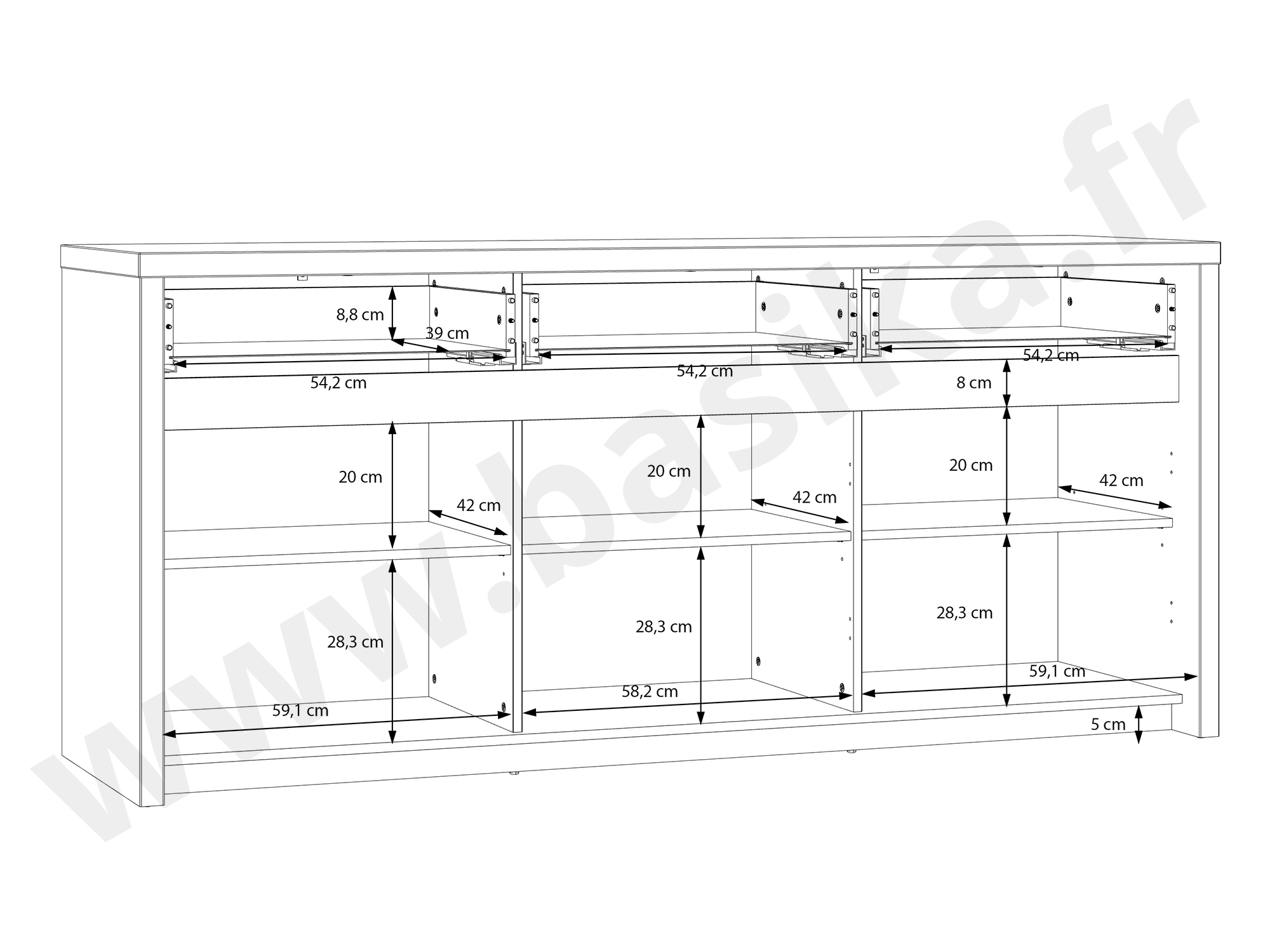 Enfilade 3 portes, 1 grand double tiroir et 1 tiroir.