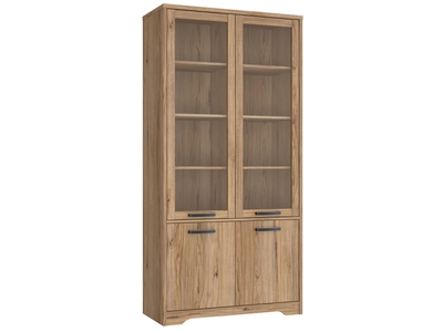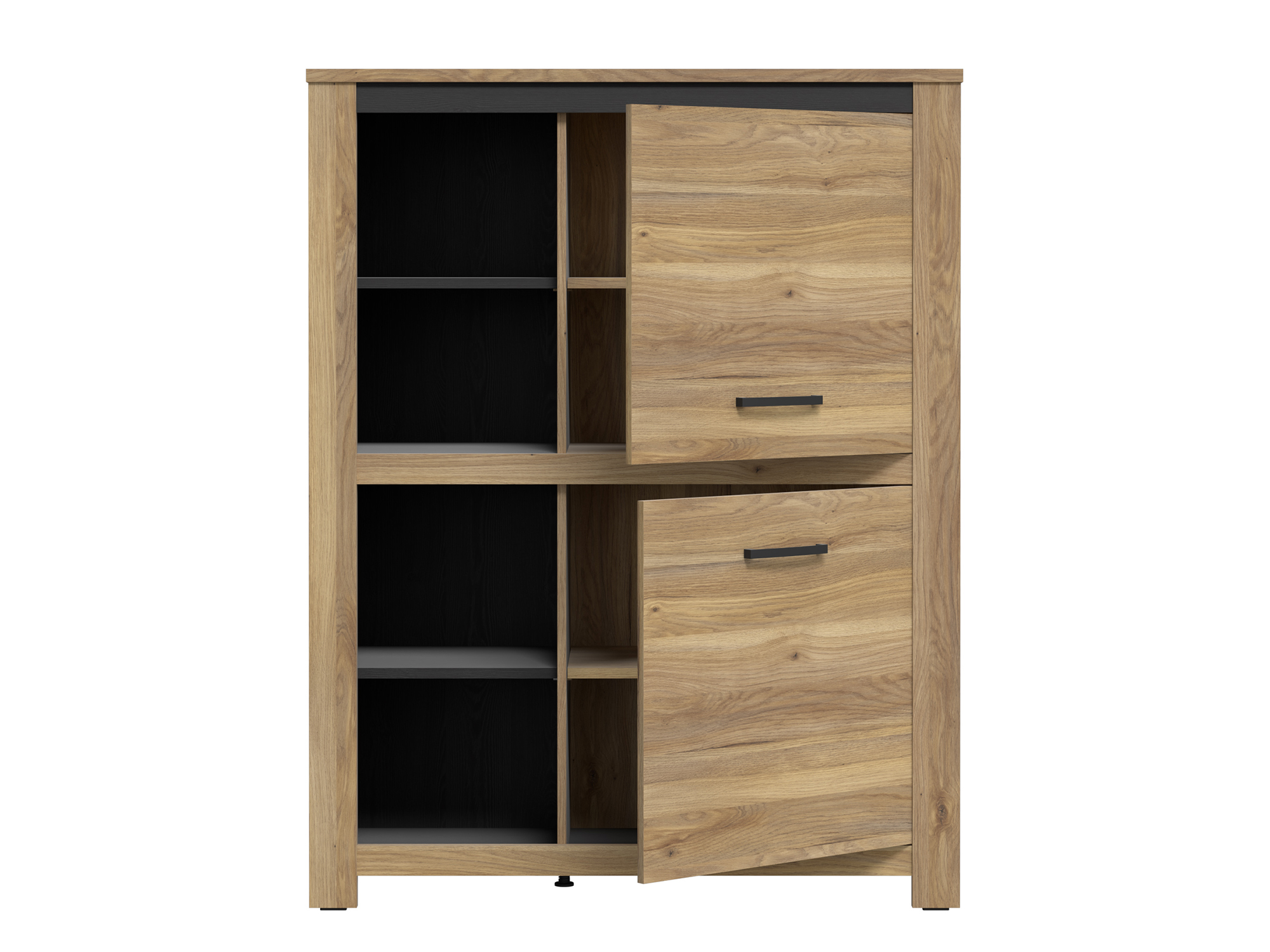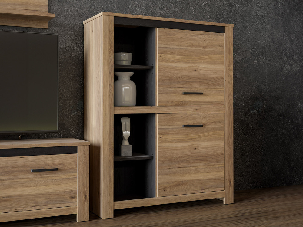 Panneaux de particules revetus de décor imitation chene. Panneau supérieur de 22mm, tablettes 18mm, autres panneaux 15mm, cloison arrière 2mm. Pieds fixes non réglables en hauteur.