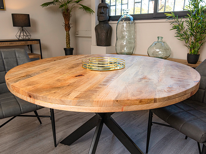 Apportez une touche d'authenticité et de caractère à votre salle à manger avec la table de repas ronde Semarang. Fabriquée en manguier massif, cette table arbore un design à la fois chaleureux et brut. Sa surface, volontairement imparfaite, offre un charme rustique unique qui fait écho aux matières naturelles et au savoir-faire artisanal.