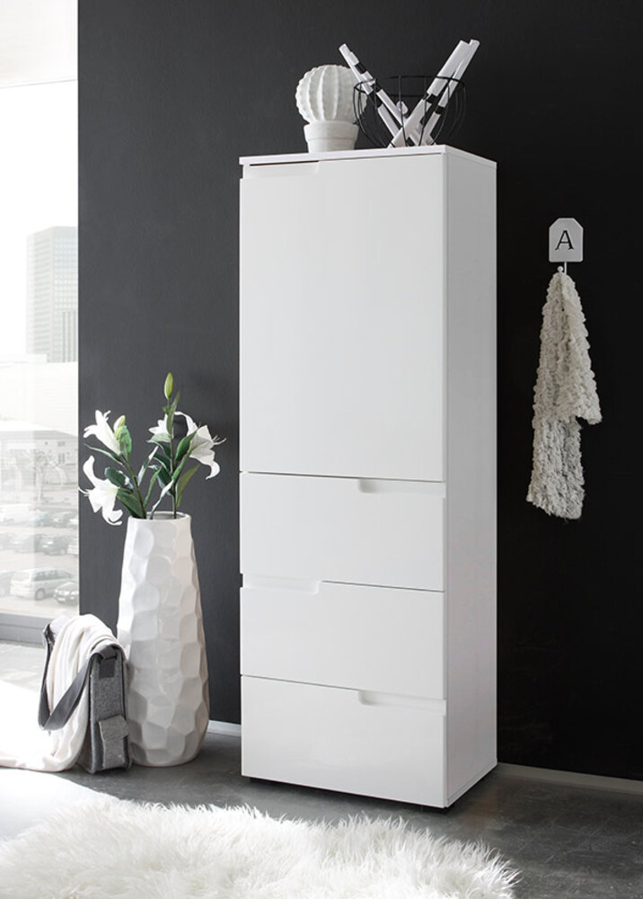 Façade de porte en MDF laquée brillant blanc et structure en blanc mat. 4 pieds en plastique.
