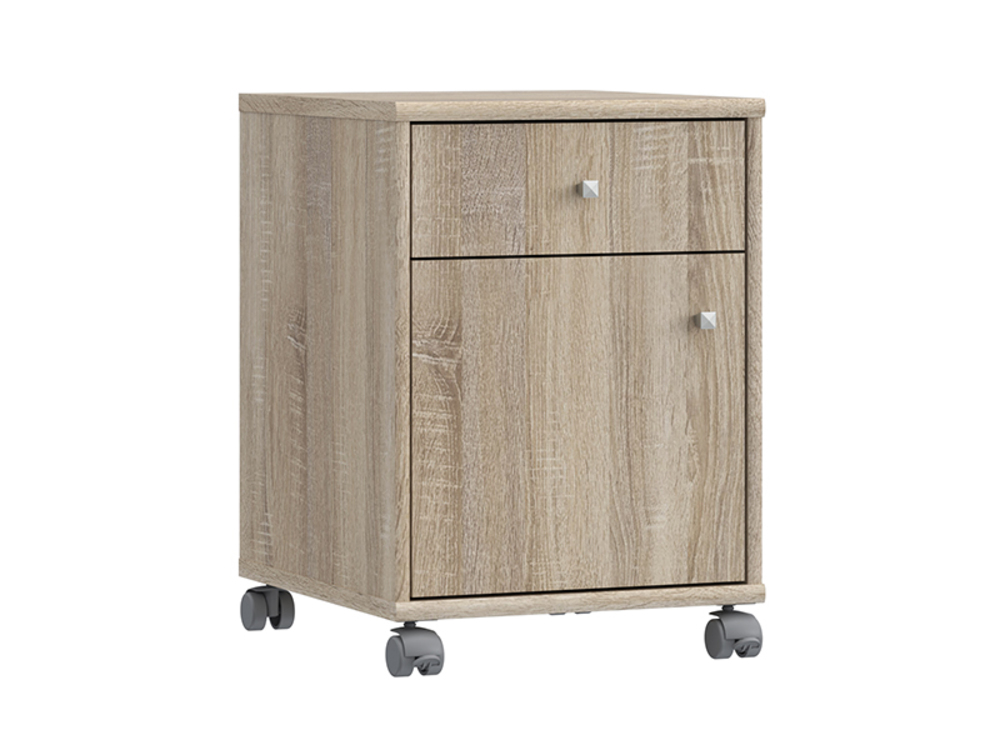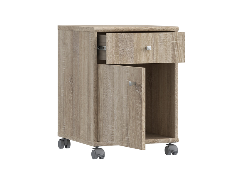 Panneaux de particules revetus de décor imitation chene sonoma.Piètement en plastique imitation aluminium.