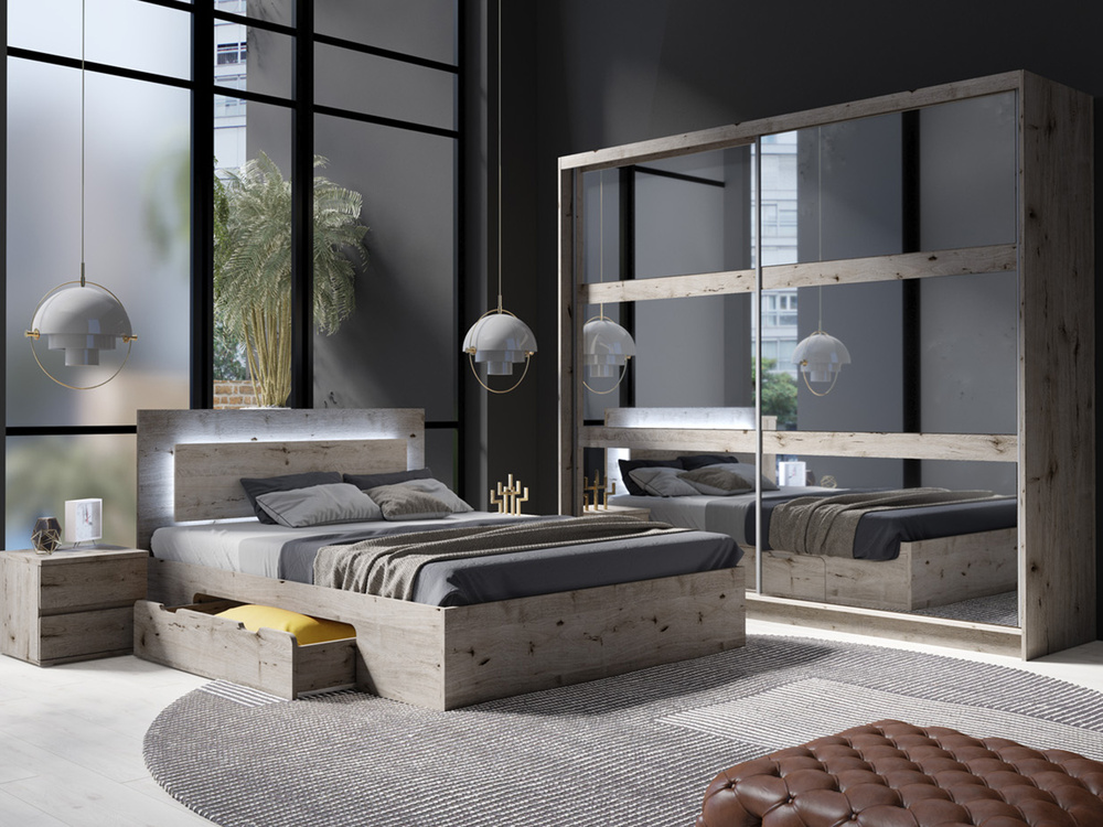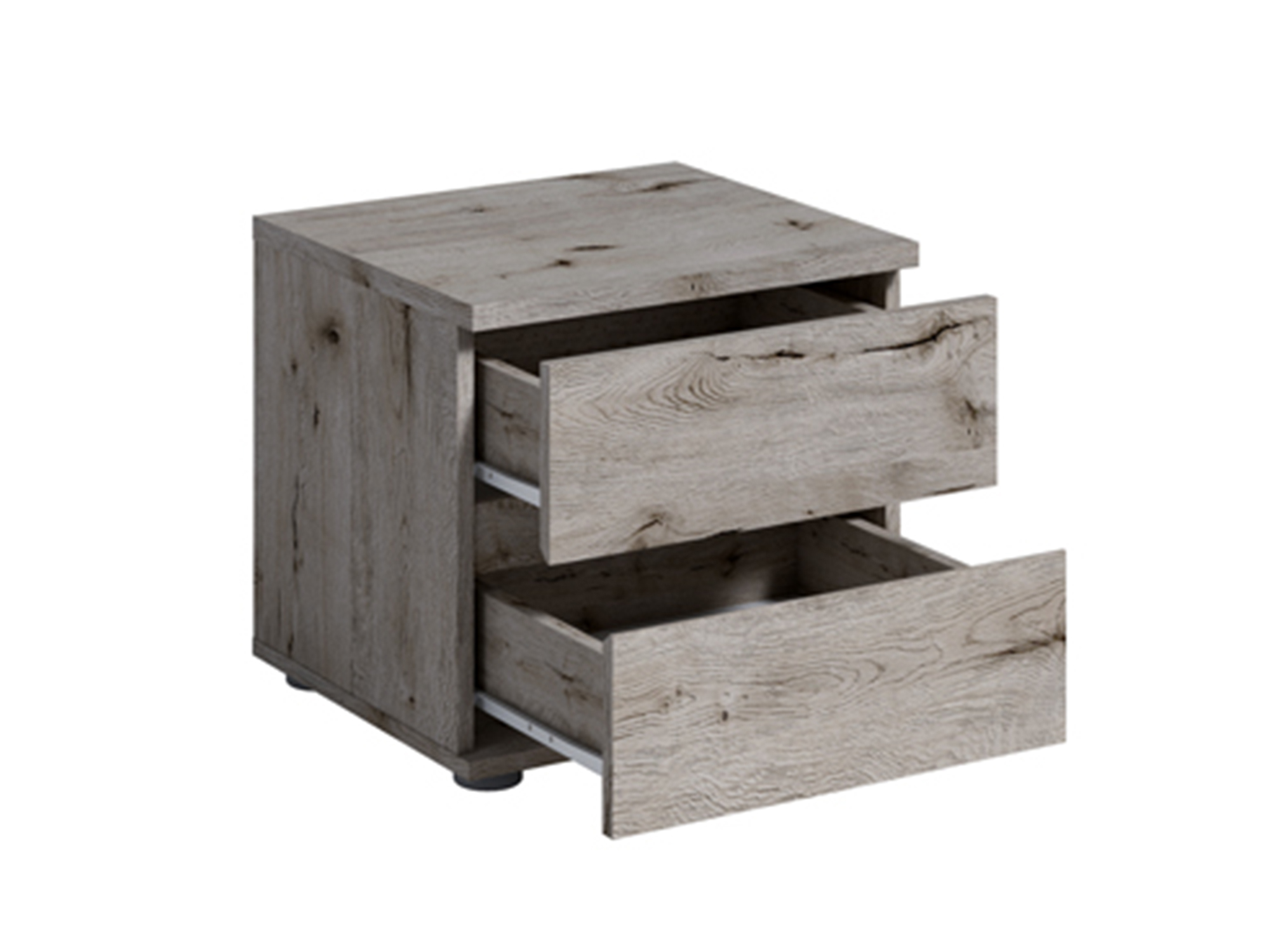 Structure en panneaux de particules mélamine 22 mm et 16 mm. Chants ABS 0,5 mm. Poignées métal. Panneau de fond en fibres de bois haute densité HDF. Piètement en plastique.