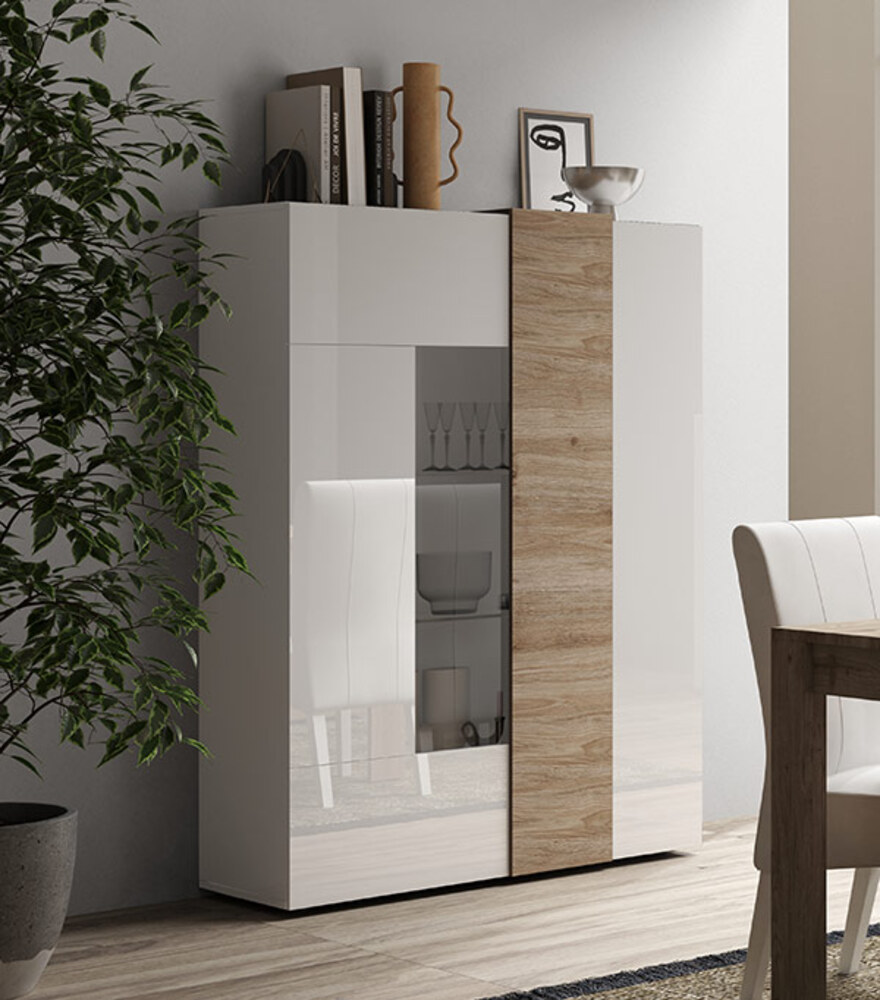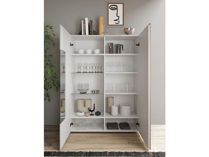 Épaisseur étagères en bois 16 mm.Porte en verre tempéré épaisseur 3 mm.Épaisseur étagères en verre 5 mm.