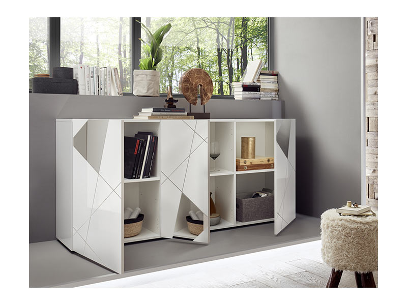 Bahut 3 portes Victoria laqué blanc brillant avec miroir