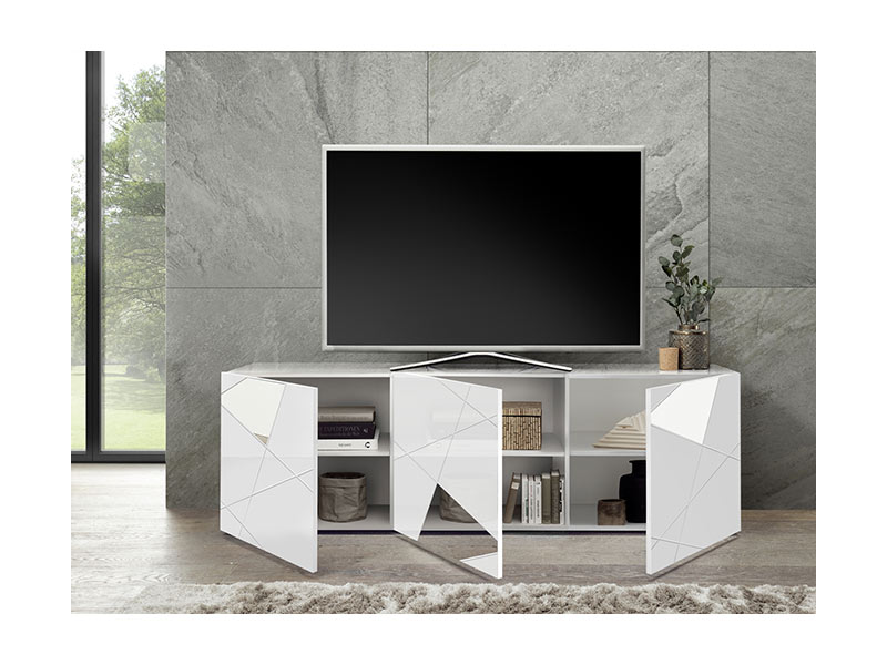 Meuble tv Victoria laqué blanc brillant avec miroir