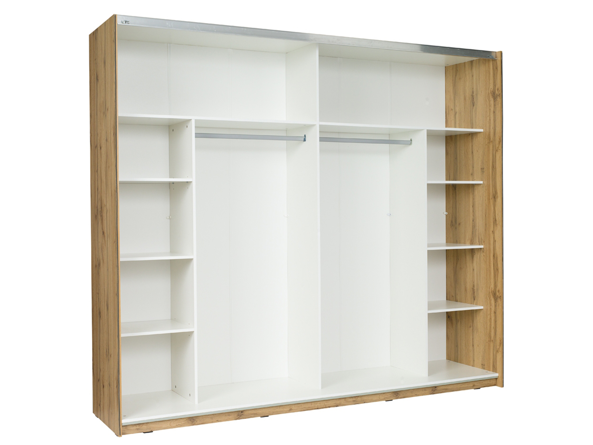 Aménagement intérieur: rayonnage sur les cotés et le dessus, penderie central.