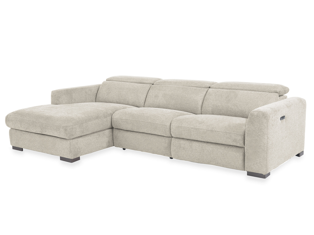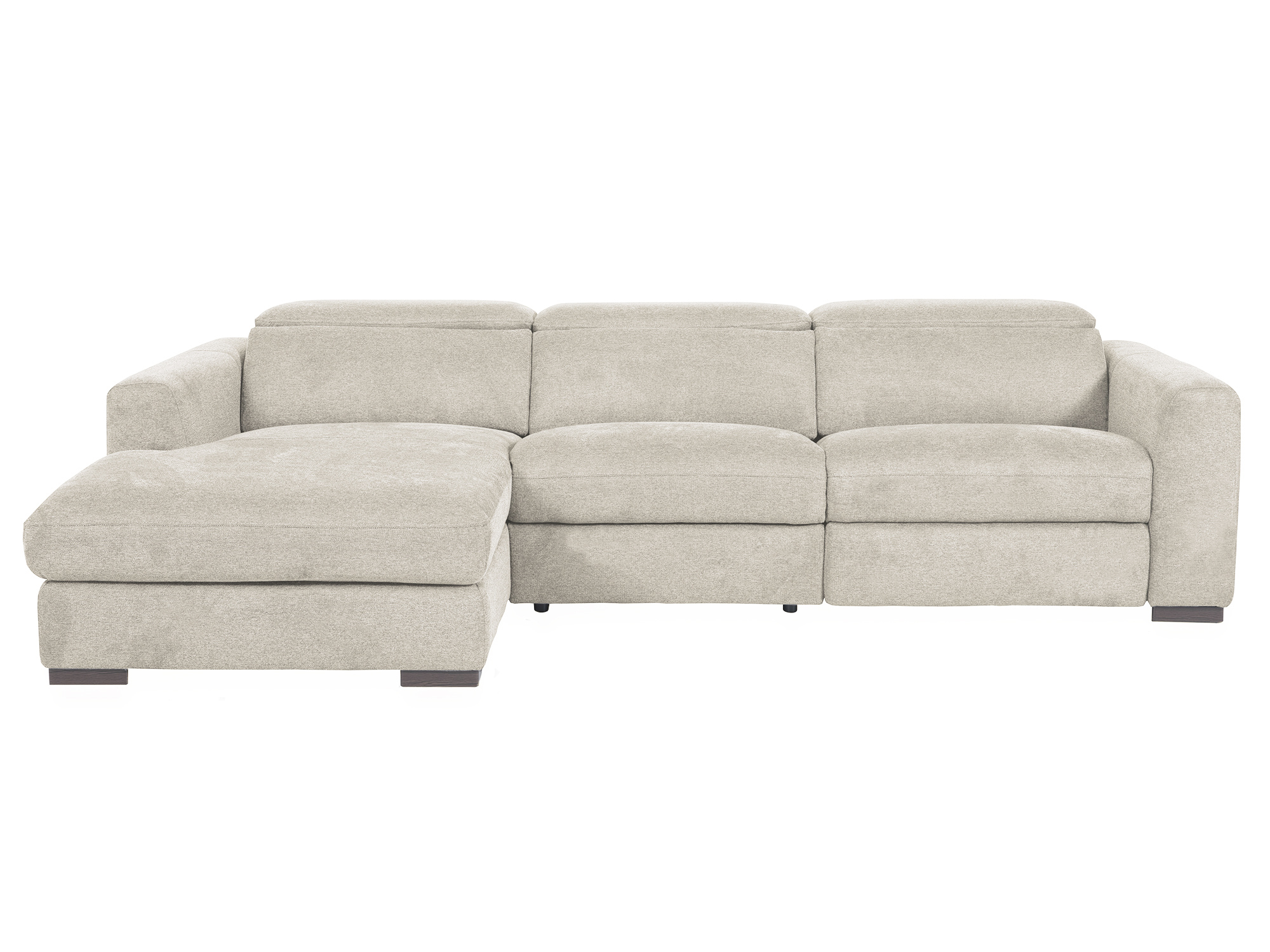 Canapé d'angle à gauche avec 3 tétières réglables en hauteur.
